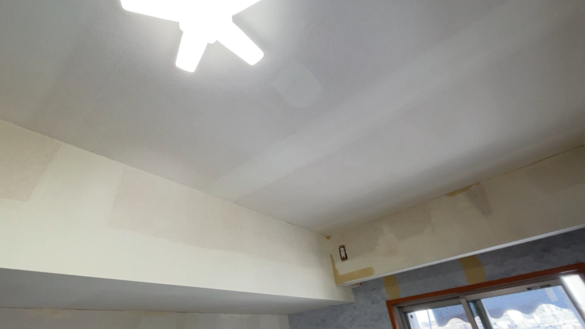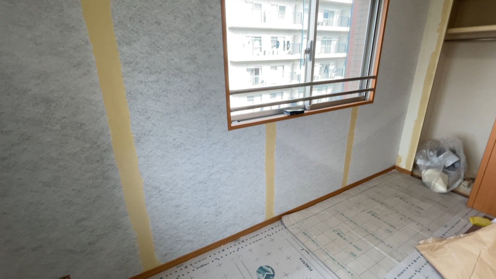 外に面してる壁にガイダンエルシートを施工し断熱効果を上げてから壁紙を施工、窓ガラスには遮熱フィルムを貼り夏の西日対策をします